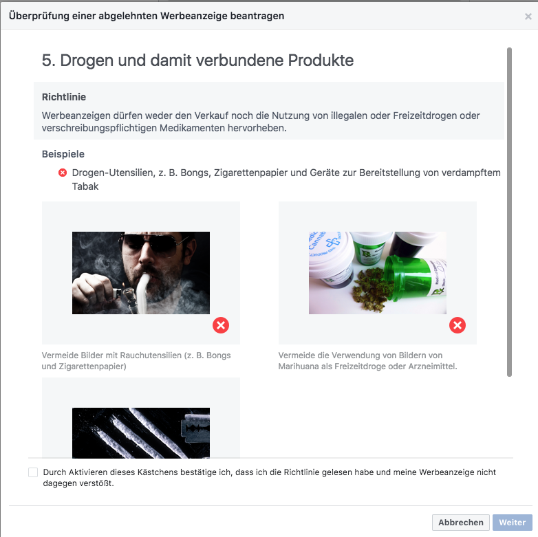 Wir haben kürzlich einen Beitrag zur Fragestellung “Sind Hanfsamen in Deutschland legal?” verfasst. Ein informatives Stückchen Content, das versucht eine Antwort auf diese knifflige und oft unklare Frage zu finden. Schon im Teaser der Anzeige und auch im Beitrag selber weisen wir deutlich darauf hin, dass er nicht als Rechtsberatung zu sehen sein darf UND wir schreiben deutlich, dass Cannabis in Deutschland illegal ist! Es befinden sich auch keinerlei kommerziellen Verkaufsangebote oder Links zu irgendwelchen Samenhändlern oder Growshops auf der entsprechende Seite. Und trotzdem geht die Werbeanzeige nicht durch die Qualitätsprüfung bei Facebook und wird mit “Es sind keine Werbeanzeigen zulässig, die illegale Drogen hervorheben.” einfach abgelehnt. Also noch ein möglicher Werbekanal, der leider nicht in Frage kommt.