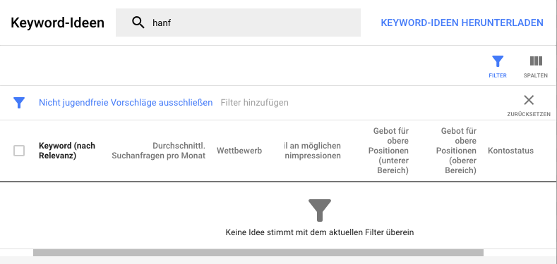 Leider liefert Google hier auf Grund der Restriktionen keinerlei Ergebnisse zurück. Es scheint also zunächst so, als würde gar niemand nach Hanf suchen oder anderen relevanten Keywords (wie z.B. “Hanf anbauen”, “Ist Hanf legal” etc.) suchen, sofern man den Daten Vertrauen schenkt. Man kann als Werbetreibender also eigentlich nicht guten Gewissens Werbung schalten, wenn jemand nach HANF sucht.